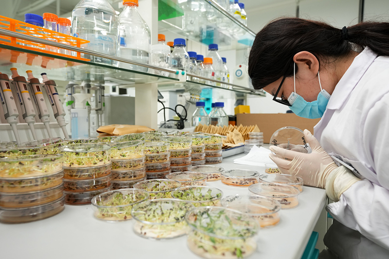 2022年4月11日,海南三亞崖州灣科技城的崖州灣種子實驗室,科研人員正在觀察種子樣本。